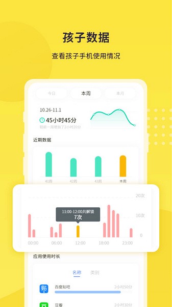 1、实时统计孩子使用设备动态,多维度的统计数据。