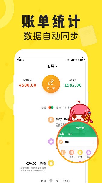 3、账单明了:根据支出做出统计,自定义周统计、月统计、年统计,形成分析图,资金管理、账单流水、余额资产,消费趋势一目了然,助你轻松理财!