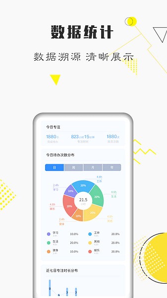 3、数据统计:您可以看到自己的每一个努力的时刻。您可以看到今日专注、累计专注的数据,成就满满。您还可以查看本日、本周、本月、本年的待办次数分布,帮助您更好的复盘总结。您还可以看到近七日的专注时长分布,您可以一目了然知道近七日的专注~