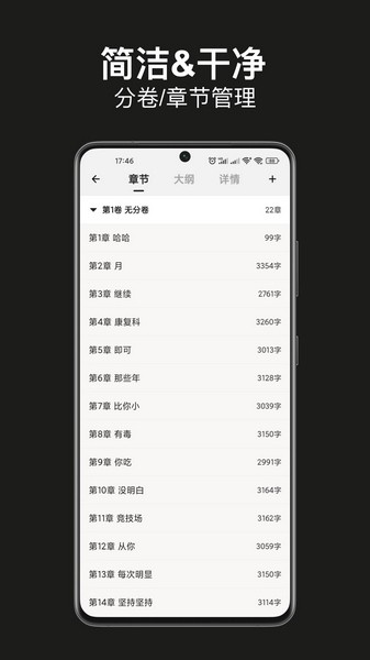 界面设计也很清爽,操作起来没什么难度,就是那种一看就会用的感觉。而且它还能统计写作效率,这点对我这种喜欢给自己定目标的人来说特别友好。写小说的时候分卷、章节管理也挺清晰的,想查哪部分的内容一目了然。