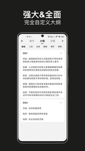 写大纲:梗概、人设、主线、辅线、事件、感情线为主自定义模板存储