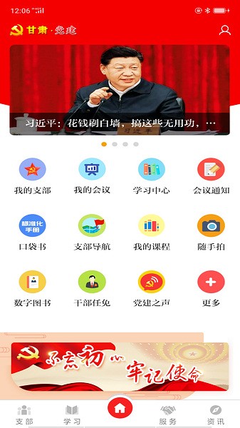 1、打开甘肃党建App,进入到主页界面,在这里我们可以看到一些日常功能,我的支部、我的会议、学习中心、市县平台等功能;