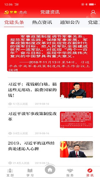 5、来到资讯界面,可以查看一些党建头条、热点资讯、通知公告等。