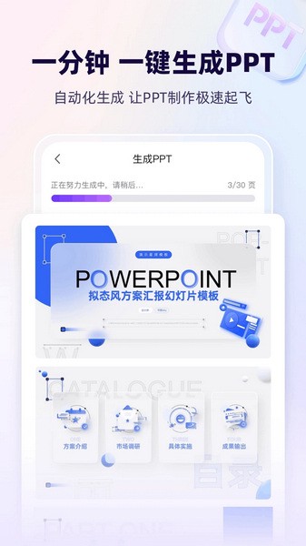 一键生成PPT:通过简单的输入,用户可以在短时间内生成一份精美的PPT,无需繁琐的操作步骤,极大提升了工作效率。