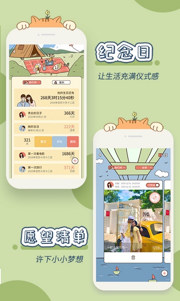 1、时光--包含相册、点滴、纪念日、愿望清单四大功能,每天使用四大功能将获得相应的爱心鼓励哦!
