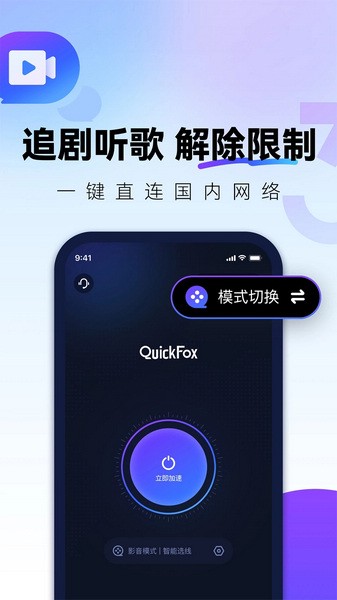 当想追剧听歌刷网页时,就先打开QuickFox的影音模式,然后重启追剧或听歌的app (是中国大陆的合法软件才有用哦) ,就会惊奇的发现,版权限制没有了,所有音乐和电视剧都能看了,速度杠杠的!