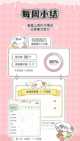 除了这些基本功能,这个App还有一些特别的设计,比如可以把任务直接添加到桌面上,随时打卡超方便!还有每周小结的功能,让我可以回顾一周的打卡情况,看看自己哪里做得好,哪里需要改进。最有趣的是养狗的玩法,完成任务还能喂食虚拟的小奶狗卡卡,这样不仅完成了计划,还增加了不少乐趣。