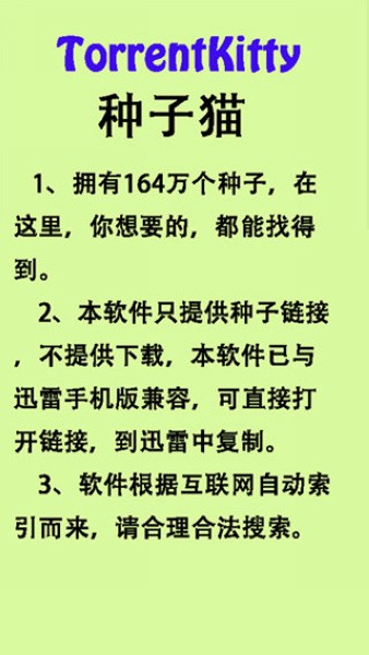 种子猫链接app是一款十分便捷好用的磁力种子资源搜索工具。这款软件内含14万各类资源的下载链接,用户可以任意取用这些链接来下载自己想要的资源。软件收录的资源链接都是通过整合各大搜索引擎而来,省去用户去搜索引擎重复尝试的步骤,让找资源更方便,且所有的资源都是合法合规可用的。