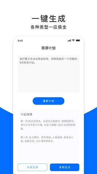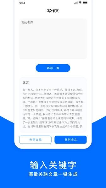 原创文章生成器软件手机版是一款神奇的文章生成工具,软件不仅能够为你提供新颖独特的素材,而且操作简单便捷,让用户轻松生成自己想要的文章内容。用户只需在平台输入自己的题目,系统就会像魔法一样为用户创作文章,而且软件内还支持一键复制、粘贴和轻松分享,大大提高了效率。更不得不提的是,软件内置了便捷的PDF转换工具,就算是新手也能轻松上手。
