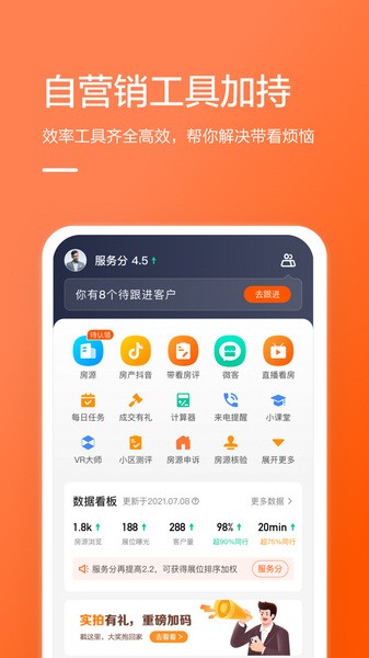 幸福客app是一款专门为房产经纪人打造的获客和推广平台,集客户和房源管理以及丰富的获客营销工具,用户也可以将每个客户的不同需求统统记录到软件中来针对性的推荐房源,一键即可轻松联系,帮助用户顺利拿下订单。幸福客经纪人版中还提供了非常全面的营销工具和私域流量运营工具,更有便捷的数据看板让用户清楚掌握自己的情况。