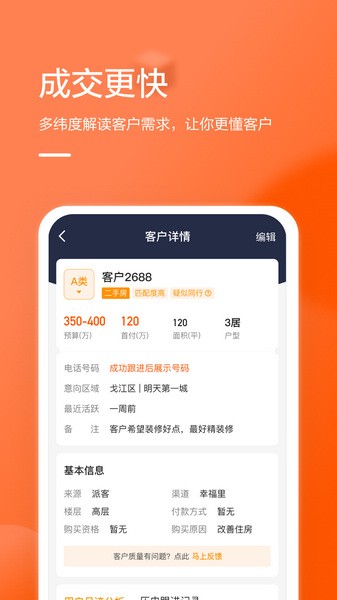 作为房产经纪人,这款工具真的太实用了,不仅能提高效率,还能让工作更轻松。特别是自动同步客户进展和历史行为记录这些功能,简直就是为忙碌的经纪人量身定制。总之,幸福客app绝对是个值得推荐的好帮手!