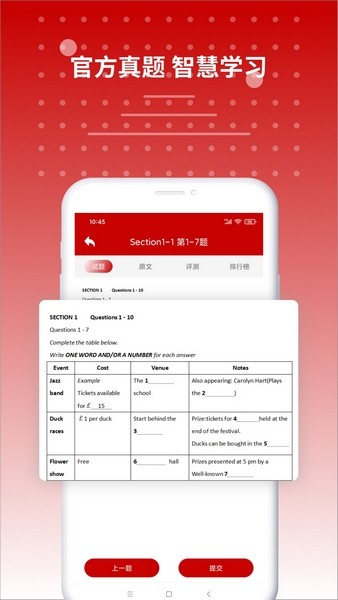 2、原文、听力、练习全方面测试你的真实雅思英语水平。每一个模块都由全方位的名师出题,而且所采用的测评题都是直接或间接来自雅思真题。力求测试结果无限接近您的真实水平。练习后可以查看解析。