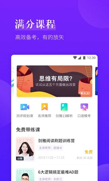 雅思考满分是专门为准备和正在考雅思的用户们打造的专业备考软件,其中为大家准备了非常丰富的英语学习教学课程,涵盖了雅思口语、雅思阅读、雅思写作以及雅思单词等多方面的内容,用户们可以结合自身学习的薄弱点来进行专项学习,针对性的学习方法也让学习变得更加高效,可以让大家在听说读写全方面都快速进步,更加轻松的通过考试。