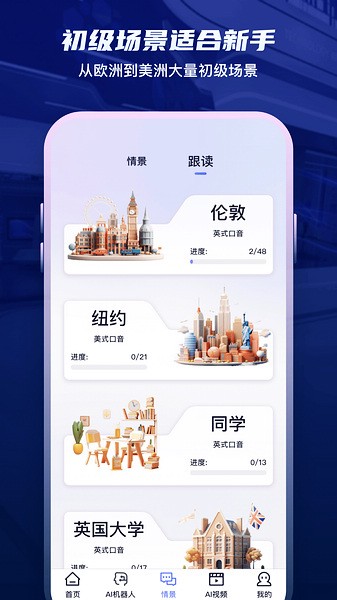 2、虚拟现实场景对话,探索世界角色扮演,开启迷人英语之旅。