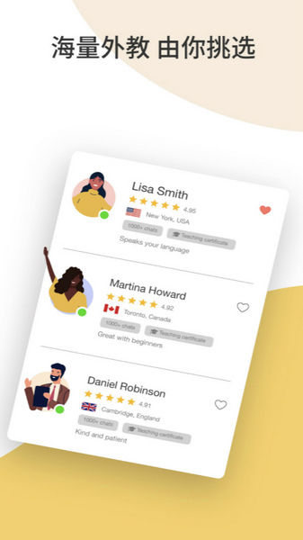 Cambly 私人教师队伍里有大学生、教师、商务人士、作家、演员,等等,每个人都能在这里找到最理想的私人教师。