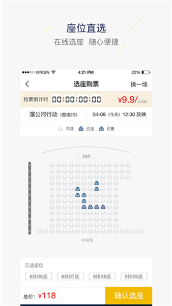 4、订票的时候可以选座,能够随时查看每一场次的订座情况