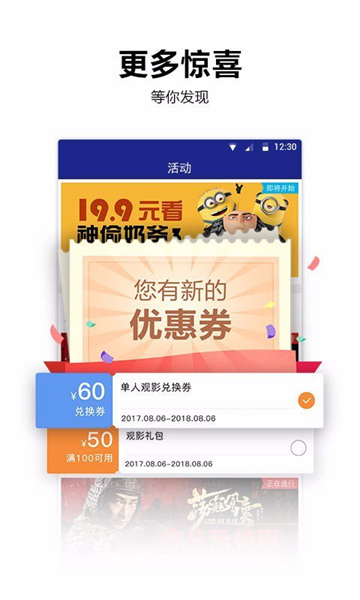 2、提供优惠券服务及影院卖品购买服务等