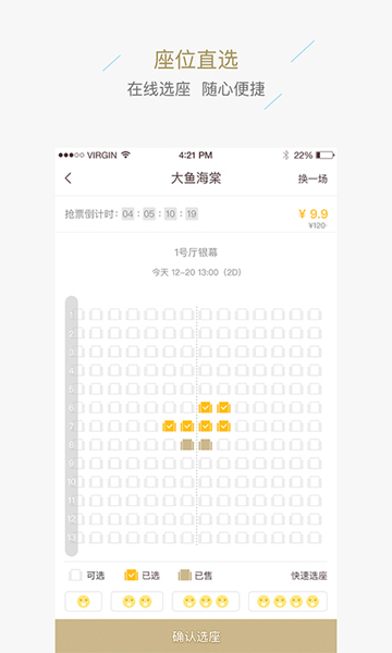 4、支持客户在线选座,客户可以自行选择最佳观影位置。