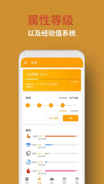 计步:可以将每日的行走步数变换为你的「力量」经验值。