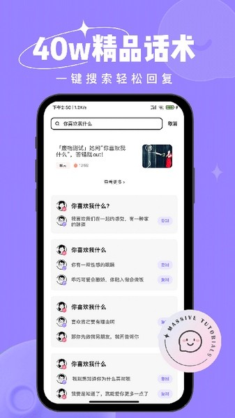 2、40万+聊天话术,搜索对方的话,找到粘贴即可轻松回复。