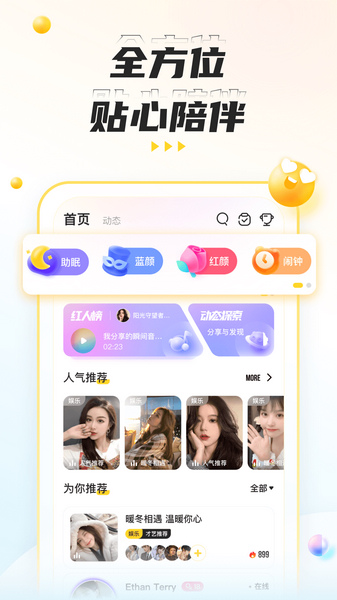 K歌互动、PIA戏、助眠、二次元、情感电台,一键上麦更好玩的互动游戏帮你快速破冰,给你24小时不断电的语聊陪伴。