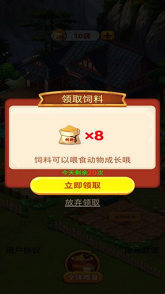 3、遇到【领取饲料】弹窗,点击【立即领取】获取饲料,用于喂食动物成长。