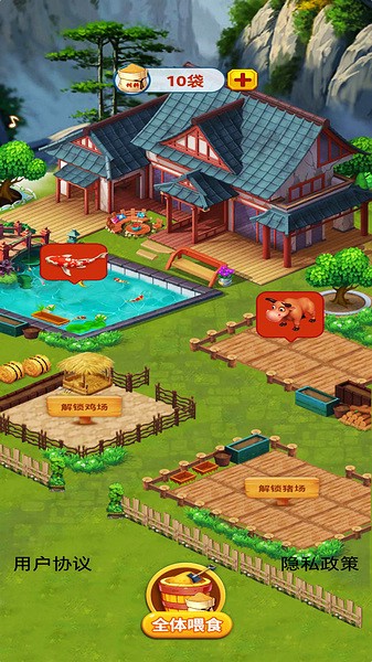2、在主界面可看到池塘、牧场等区域,下方有【全体喂食】按钮,可管理农场设施。