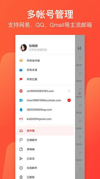 -多个邮箱帐号集中管理,支持跨帐号查看所有收件箱、未读邮件和红旗邮件。