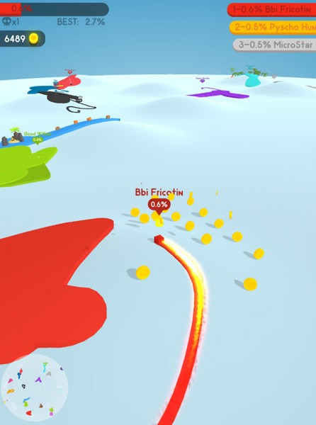 休闲竞技游戏,玩法简单,在不同关卡地图上会有不同的队伍,玩家需要操控游戏角色参与战斗,存活到最后即可通关,不同队伍拥有不同的颜色,需要不断扩充自己的地盘,获取更多金币购买道具