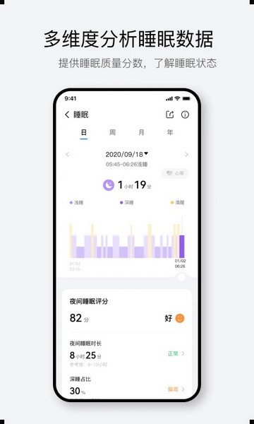 3、睡眠情况分日、周、月、年进行记录,用户能查看不同阶段的睡眠质量;