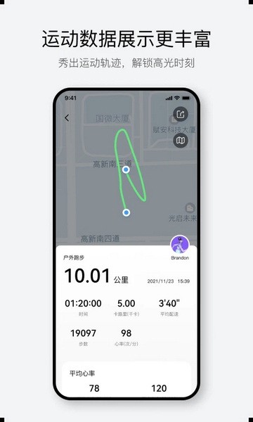 【多种运动记录】支持100+运动模式,记录运动时的时长、心率、消耗、距离、轨迹、配速、运动目标等数据,并支持语音播报运动状态。