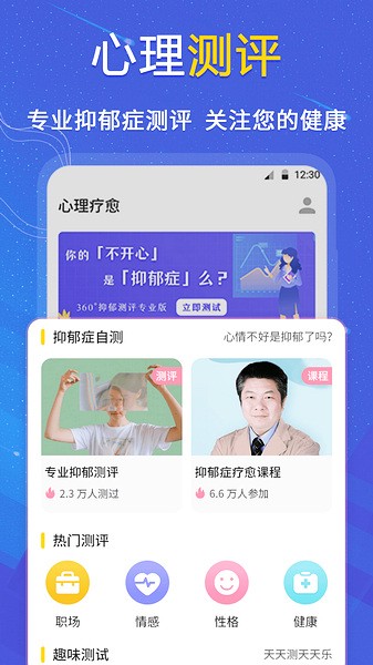 【测评类型丰富】多类心理健康测评,有关乎职场的职业性格测评、职场竞争力测评,有发掘你的人格魅力的人格魅力评估、智商检测器;还有为你提供专业的爱情测评、异性魅力评估等。你的需求我们都有。