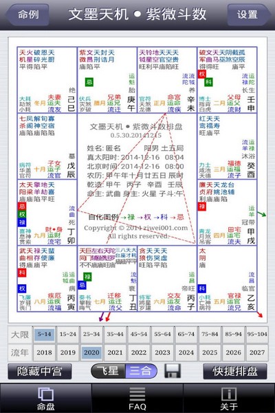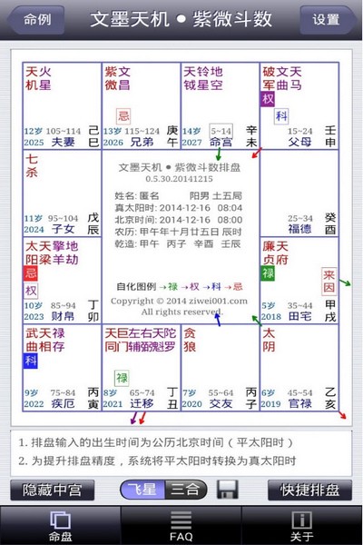 5、提供精心设计的排盘界面,风格简约而不简单,兼容命理师和紫微斗数爱好者的既有使用习惯,盘面布局和配色风格与使用广泛的飞星、三合和四化排盘软件保持一致,大幅降低使用门槛。