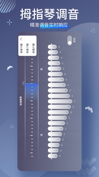 随身拇指琴app官方版是一款专用于拇指琴的手机调音器软件。这款软件能够精准识别用户的拇指琴声音,可针对不同类型的按键设置进行调音辅助。同时,软件能够为用户提供模拟拇指琴弹奏功能,借助辅助演奏功能可以去练习演奏不同的曲目。此外,随身拇指琴app官方版内置了不同级别的演奏课程供用户学习使用。