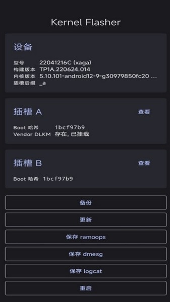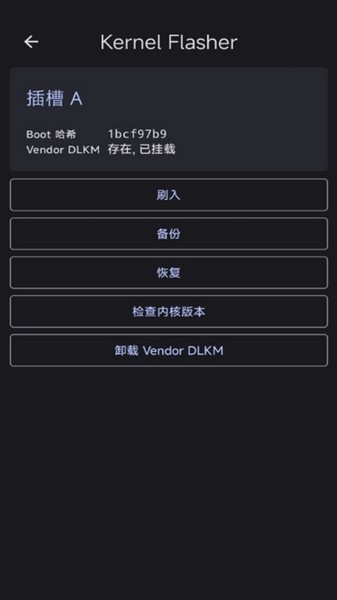 备份文件内容:备份文件包含内核相关分区数据(如boot、recovery、vendor_dlkm等),用户可通过Kernel Flasher的恢复功能验证备份完整性。
