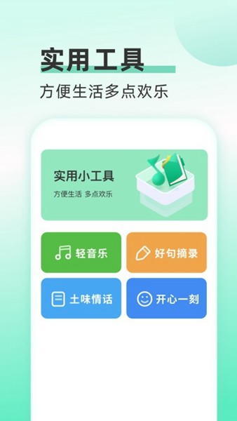 除了监控流量,“欢乐流量宝”还有一些有趣的小工具,比如听音乐、土味情话、好句摘录和开心一刻这些功能,让使用app的过程不再无聊。这种设计挺贴心的,不仅实用还能带来一些乐趣,用起来应该会很舒服。