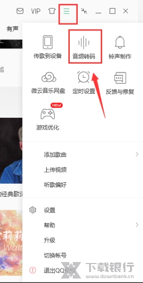 1、首先我们打开安装好的QQ音乐软件,进入到主界面后,我们在界面的右上角点击菜单选项,然后在下拉的选项中找到音频转码选项并点击打开进入该界面