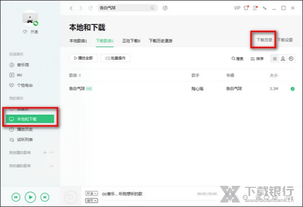 2、开始下载后用户可以点击界面左侧的本地和下载选项,里面就会显示正在下载的歌曲,用户可以点击右上角的下载目录选项,然后对歌曲下载保存的目录进行设置,如下图所示,用户可以点击更改目录设置其他的目录后点击完成即可。