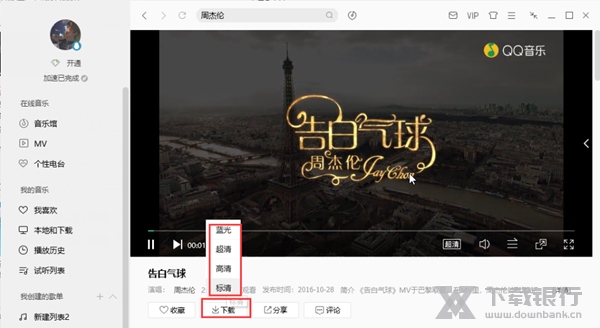 2、进入歌曲mv播放界面,在界面下方有收藏、下载、分享、评论等选项,我们点击下载然后会弹出需要下载的音乐品质,有标清、高清、超清和蓝光选项,注意选择的音质越清晰内存就越大。用户选择完成后就开始下载了。