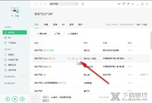 1、首先我们先打开QQ音乐软件进入主界面,在界面上方搜索想要下载的歌曲或者歌手名称,然后在下方出现搜索结果,小编以搜索告白气球为例,搜索出来后点击歌曲后方的下载图标点击后选择音乐的品质,然后开始下载。
