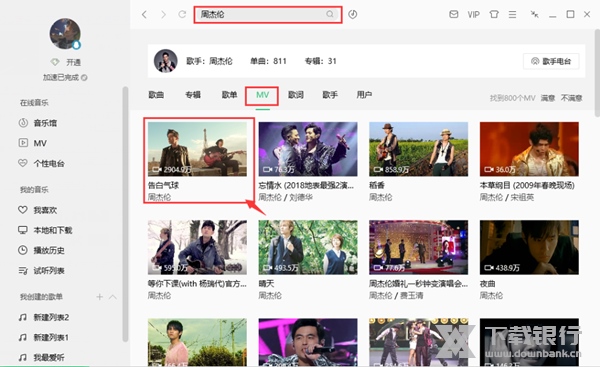 1、首先我们先打开QQ音乐进入主界面,在界面的搜索框中输入想要下载的mv名称或者歌手名称,小编以搜索周杰伦为例,在界面下方会出现相应的歌曲、专辑、歌单、mv、歌册等选项,我们选择mv后在下方会出现具体的歌曲,点击后进入mv播放界面。