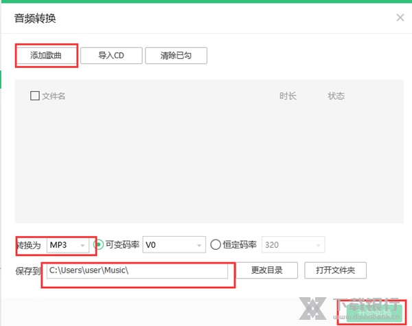 2、进入音频转换界面后,我们点击添加歌曲先将要转换的mp3格式添加进来,添加完成后在界面下方可以设置转换的格式,设置完再更改保存的目录,将软件保存到合适的位置,然后点击最下方的开始转换,等待转换完成后就可以得到mp3格式的音乐了。