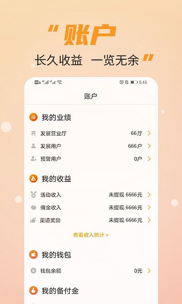 3、展示多项业绩数据,该栏下面展示发展营业厅、发展用户以及预警用户多种内容栏;