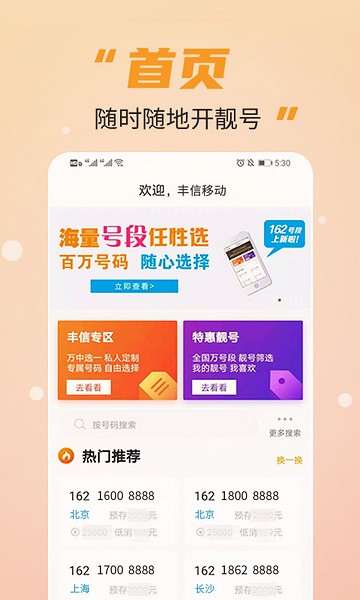 6、海量移动靓号资源,首页向用户推荐热门的移动靓号,还设置了丰信专区和特惠靓号版块;