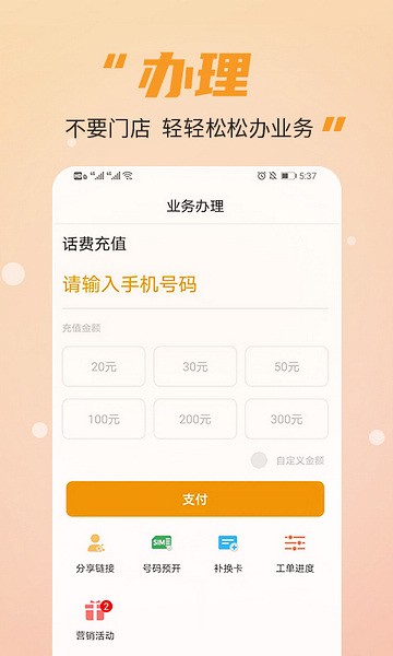 5、便捷多样的办理服务功能,这里面有话费充值、实名制补偿以及补换卡等多种功能;