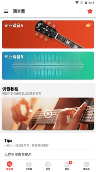 集合吉他调音器、尤克里里调音器、贝斯调音器、小提调音器、大提琴调音器等多种调音器,音准识别算法领先,调音精准快速;文字提示清晰,抗干扰能力强。