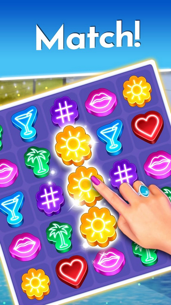 游戏的画面非常精美,场景设计充满了热带风情,角色的服装和表情也很丰富多样,可以让人沉浸其中。尤其是三消关卡的设计,不仅考验手速和眼力,还能通过完成任务获得奖励,进一步推动剧情发展,这种多重玩法的结合让游戏体验更加丰富。