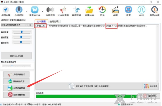 6.如果用户是选择由多个播报人将不同的文字段落转成语音的话,最后,要将多个角色合成,就可以在文字段落的逗号前,指定该句文字由特定的某位发音人播报。设置完成后,再点击“合成声音存储”按钮即可将该语音文件进行保存。