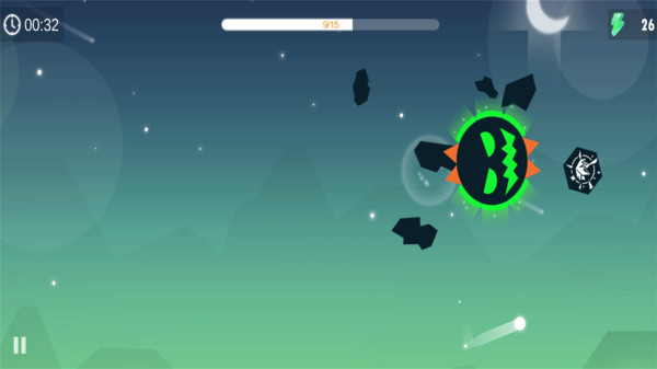 1、玩家控制着自己的星球不断地撞击比自己小的星球,然后吞噬星球碎片壮大自己。
