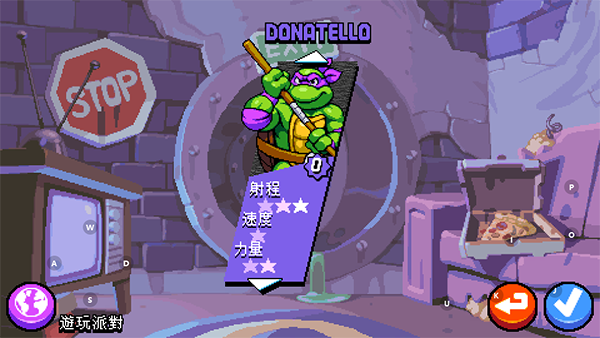 1、与《忍者神龟》的经典角色一起通关,包括忍者神龟英雄莱奥、拉夫、唐尼和麦奇,也可选择新增游戏角色爱普、斯普林特师父或凯西·琼斯!